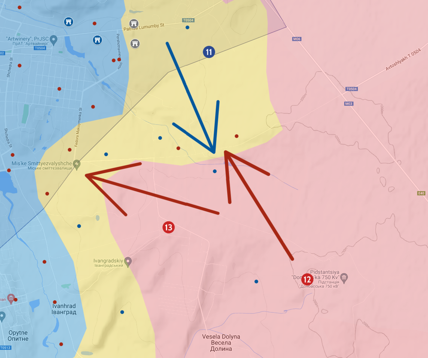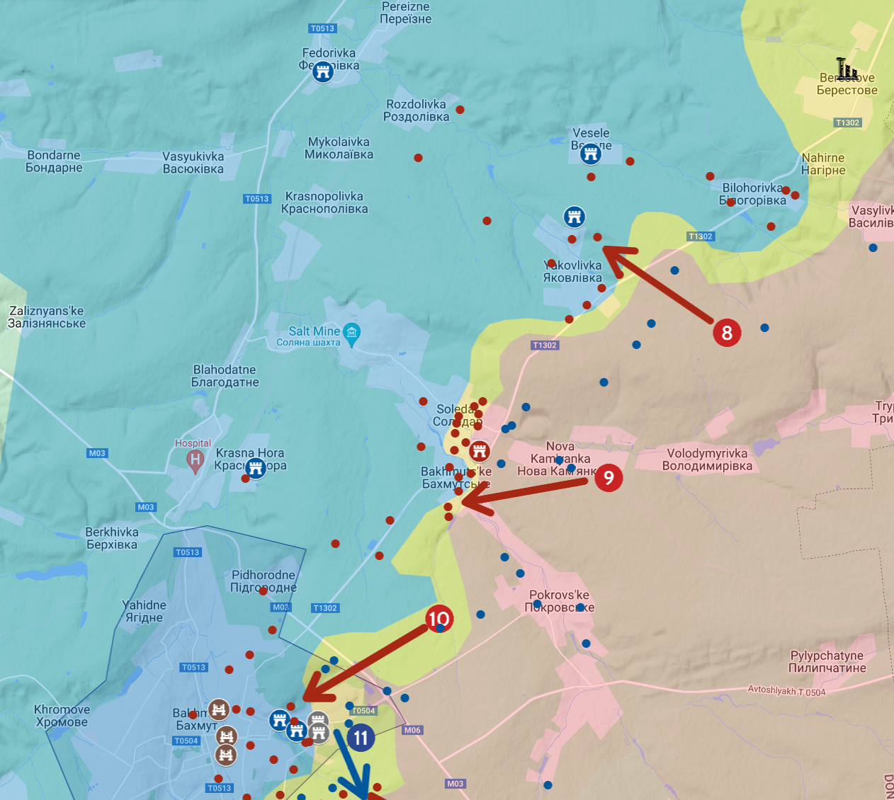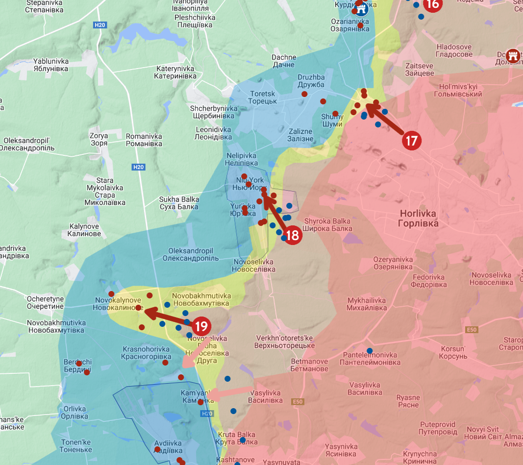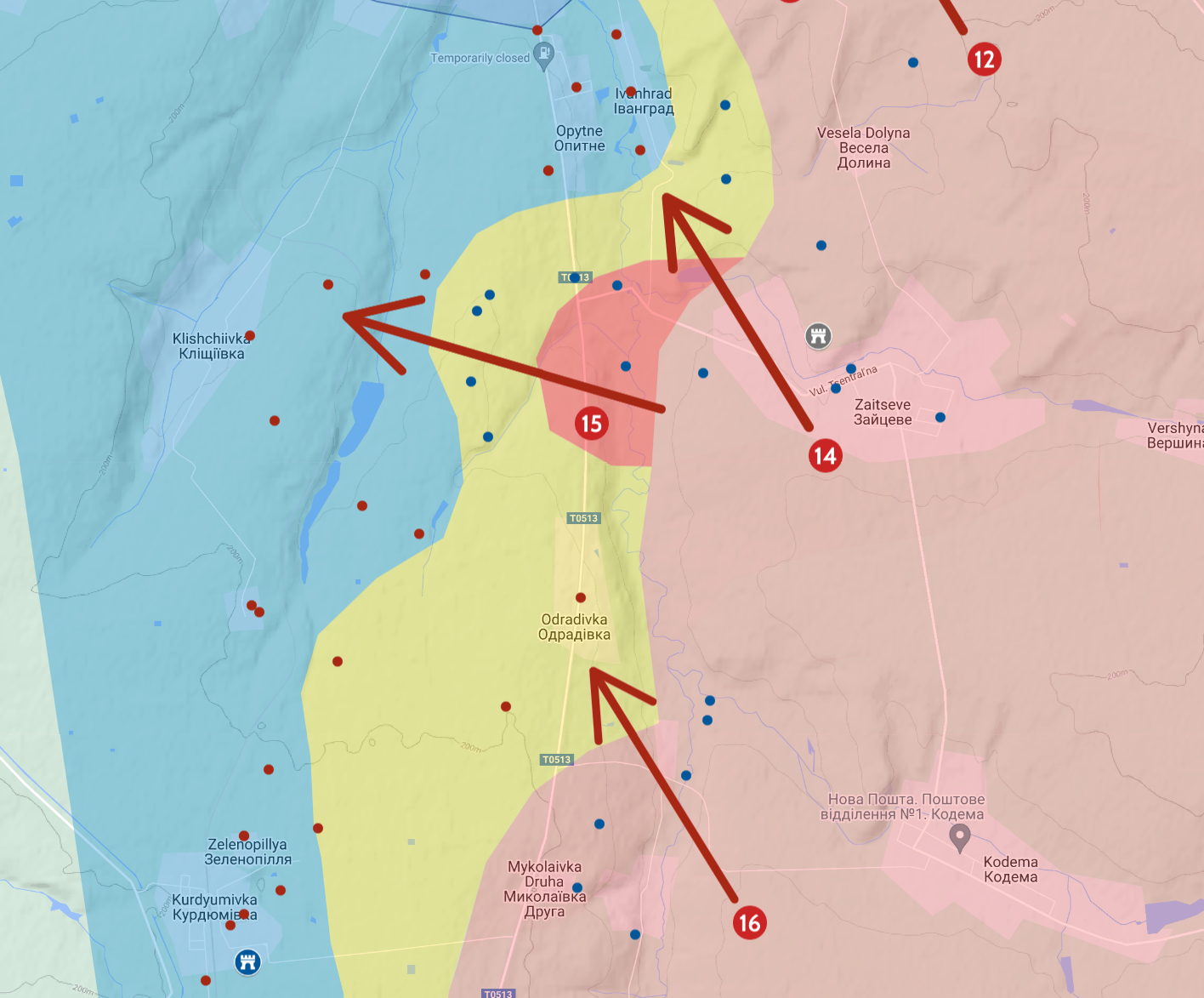 Russia is pushing west toward Klishiivka (15) and north toward Odradivka (16). Unfortunately, I do not have news about either of these areas.