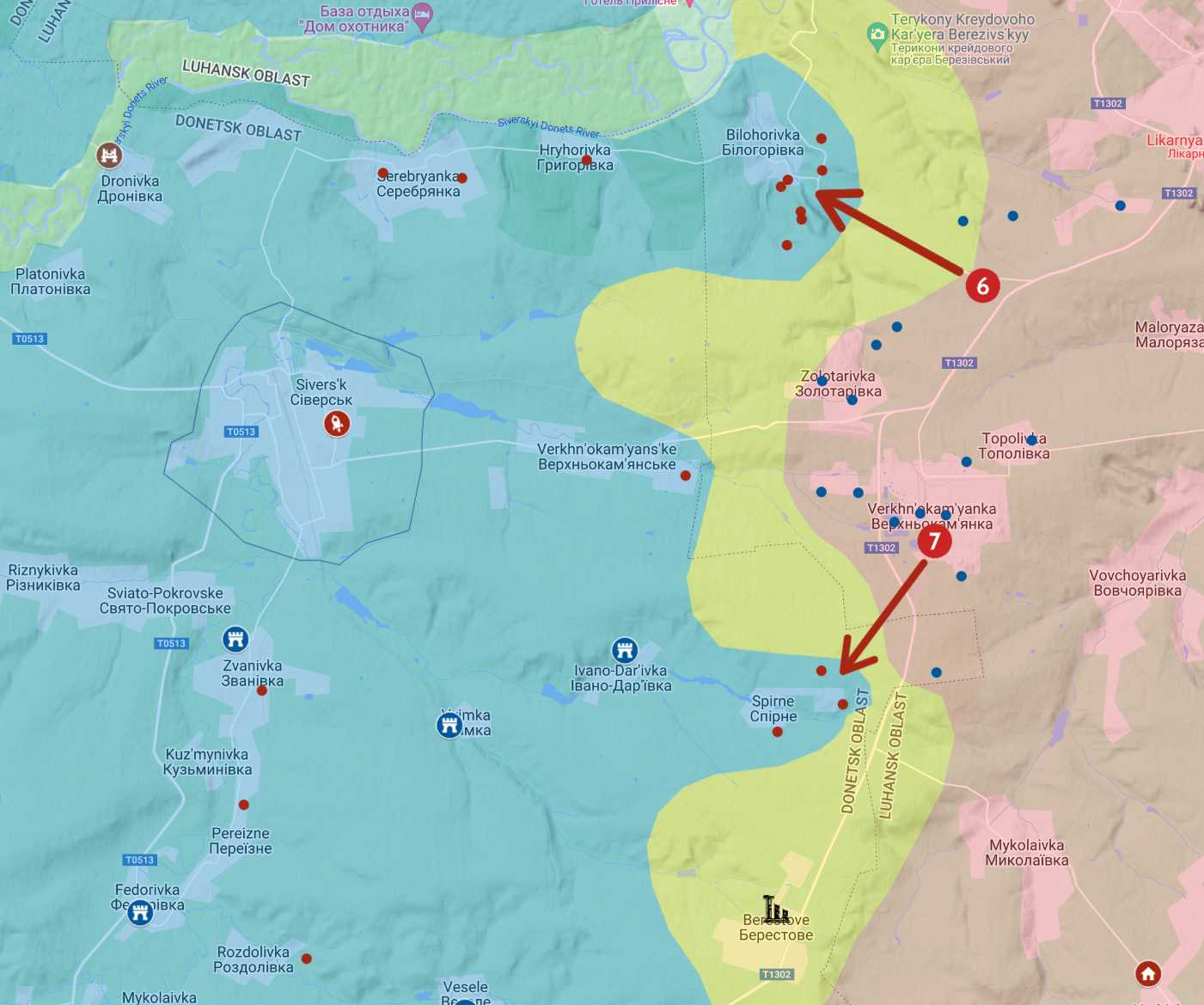 Near Siversk, Russia attacks Bilohorivka (6) and Spirne (7) to slow the Ukrainian advance. Unfortunately, I have very little news about either of these Russian attacks. However, Ukrainian and Russian sources suggest Ukraine may be nearing the Lysychansk Oil Refinery, so maybe the Russian attacks near Spirne are not going well.