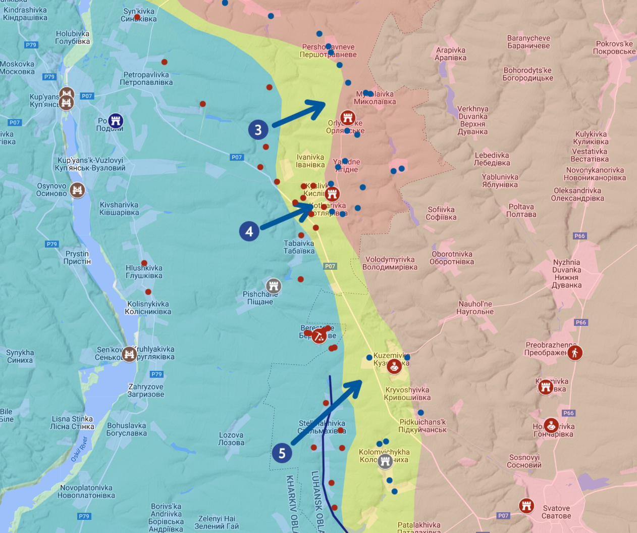 East of Kupyansk, Ukraine is steadily applying pressure to the east (3,4,5). Ukraine is heavily shelling the string of towns between Pershotravneve and Kotlyarivka, and in return, Russia is heavily shelling the area near Kyslivka and Kotlyarivka.