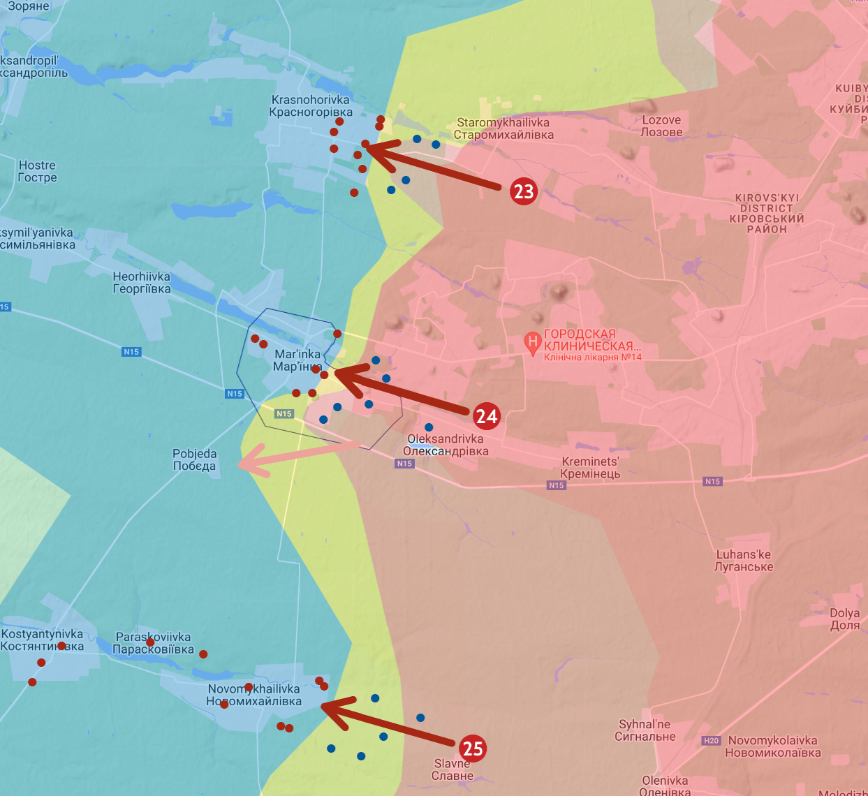 Russia is also attacking Nevelske (22), Krasnohorivka (23), Marinka (24), and Novomykhailivka (25) without notable changes.