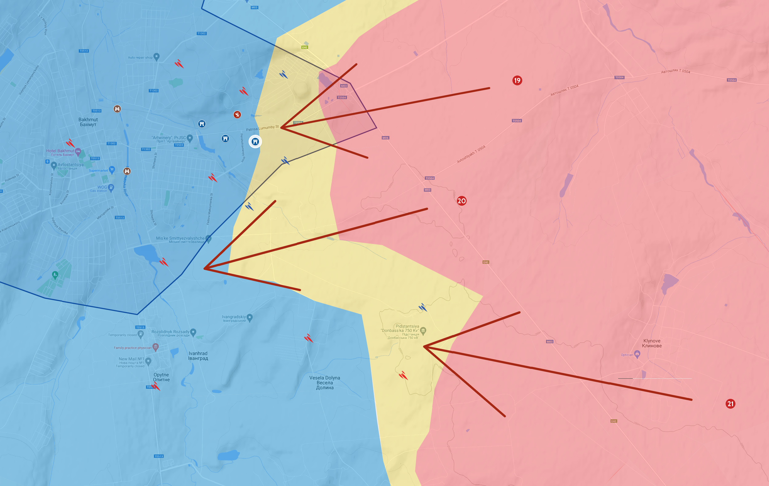 In Bakhmut, Russians have reached the industrial zone in the east after having abandoned this position and withdrawn several weeks ago. There is fighting near the Ceramic factory (19). I have the factory marked as the easternmost Ukrainian fortification marker in the city. The map may exaggerate the extent of battle in the city's south.
