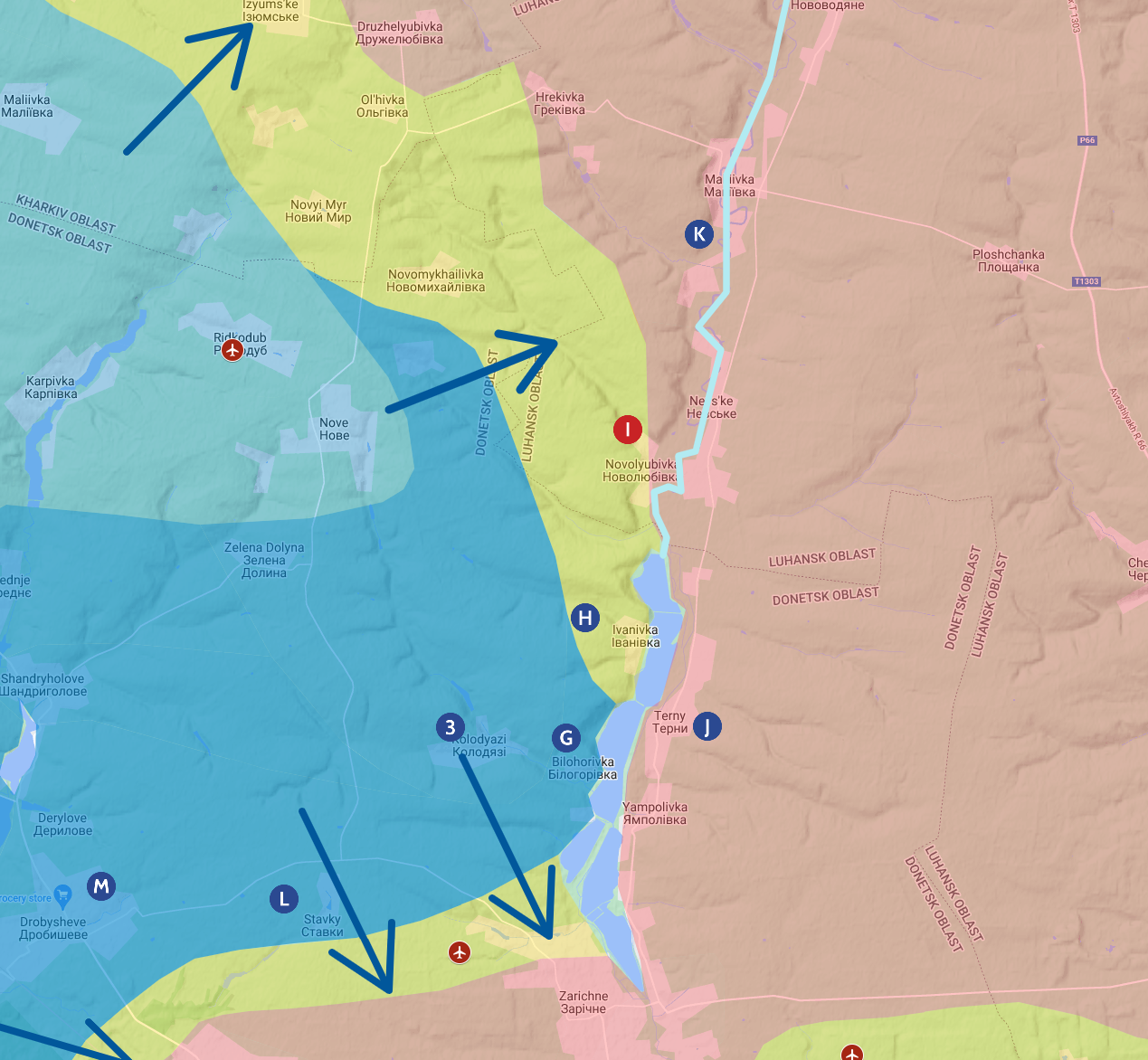 Ukraine liberated Bilohorivka (G) on the west bank of Lake Terny and perhaps Ivanivka (H). Novolyubivka (I) is still in Russian hands. There are rumors that Ukraine crossed Lake Terny and entered Terny today (J), but I believe the story is far-fetched. More likely, recon or special forces are operating in the area. Ukraine is generally moving toward Makiivka (K), but they have not yet reached the town.